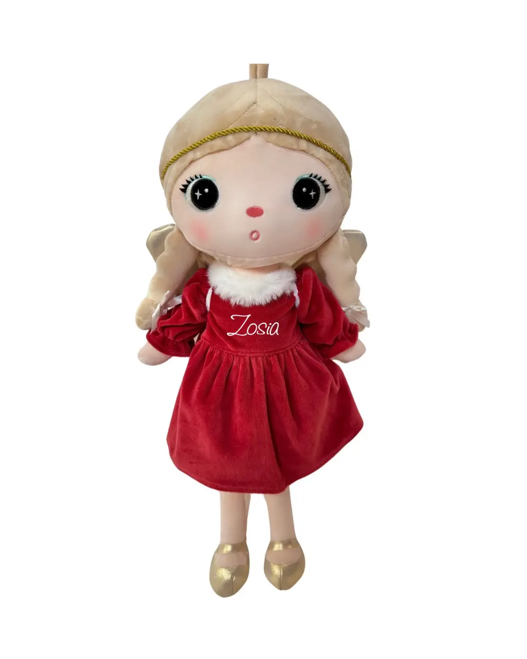 Welurowa sukienka w kolorze klasycznej czerwieni oraz białe detale tworzą luksusowy i odświętny wygląd. Złota aureola i lśniące skrzydełka dodają jej niebiańskiego blasku.