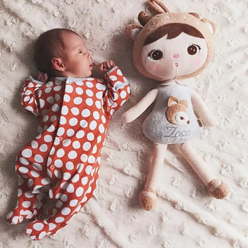 Duża głowa, wyraziste oczy z długimi rzęsami oraz charakterystyczne długie nogi to detale, które przyciągają uwagę malucha i zachęcają do chwytania oraz tulenia.